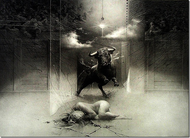 O πρώτος ταύρος, αυτός που η Σιμόν περίμενε να της φέρουν τ’ αρχίδια του ωμά σ’ ένα πιάτο, ήταν ένα είδος μελαψού τέρατος που η εφόρμησή του μεσ’ απ’ το τορίλ στην αρένα ήταν τόσο κεραυνοβόλα ώστε, παρ’ όλες τις προσπάθειες και τις κραυγές, ξεκοίλιασε το ένα μετά τ’ άλλο τρία άλογα προτού ακόμη αρχίσει το κανονικό μέρος της ταυρομαχίας. Τη μια φορά μάλιστα, τα κέρατά του άρπαξαν το άλογο και τον καβαλάρη, τους σήκωσαν μαζί ψηλά στον αέρα και μετά τους ξαναπέταξαν με πάταγο προς τα πίσω. Μπήκε όμως στη μέση ο Γρανέρο και τράβηξε τον ταύρο προς το μέρος του, οπότε πια η μάχη πήρε μπρος ζωηρά και συνεχίστηκε μέσα σ’ ένα παραλήρημα από ιαχές. Το παλικάρι έκανε το φρενιασμένο ζώο να περιστρέφεται ολόγυρά του μέσα σε μια τριανταφυλλένια μπέρτα• σε κάθε γύρο, το κορμί του τιναζόταν προς τα πάνω μ’ ένα είδος σπειροειδούς εκτίναξης κι απέφευγε παρά τρίχα ένα τρομαχτικό χτύπημα. Τελικά, ο θάνατος του ηλιακού τέρατος συντελέστηκε χωρίς καμιά παρέκκλιση από το τελετουργικό: το ζώο τυφλώθηκε απ’ το άλικο ύφασμα και το ξίφος μπήχτηκε βαθιά μέσα στο ήδη καταματωμένο σώμα. Ξέσπασε τότε μια απερίγραπτη ζητωκραυγή, καθώς ο ταύρος, τρικλίζοντας, όπως οι μεθυσμένοι, γονάτισε και σωριαζόταν καταγής με τα πόδια ψηλά, ξεψυχώντας.